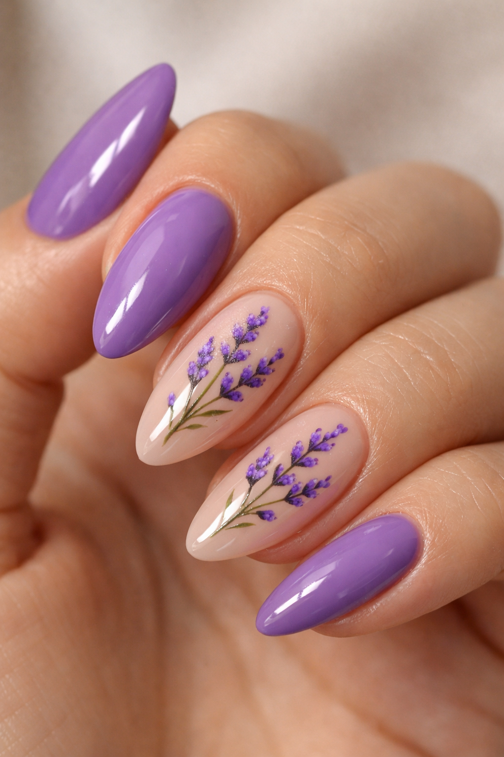 Lavender nails are among the most sought-after trending pastel nails right now. The soft, lilac-colored hue provides an ethereal and feminine style that is perfect for any style and season. In this look, shiny almond-shaped nails are adorned with gorgeous lavender tones and accent nails are decorated with delicate floral designs of lavender branches on a bare base.