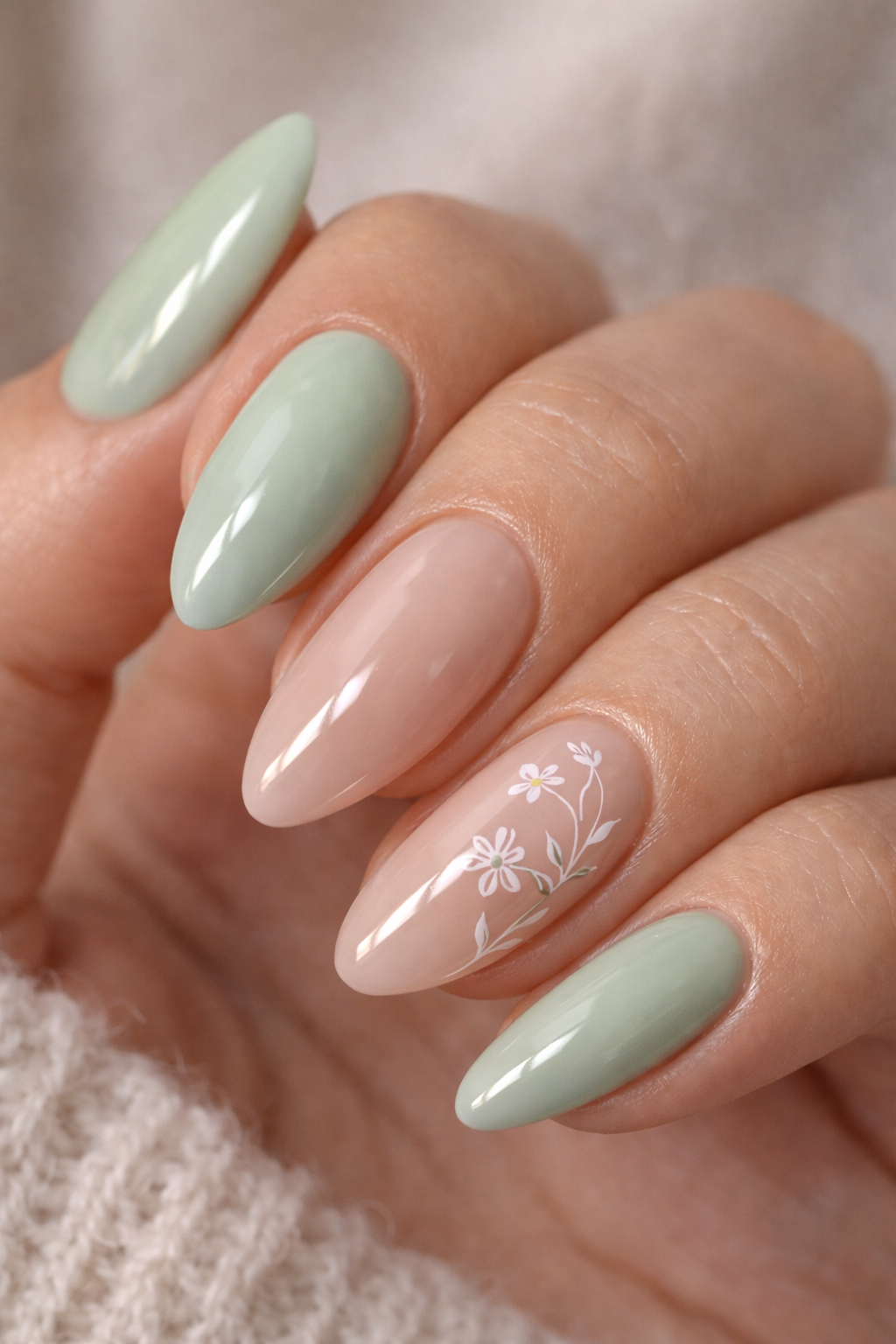 Mint green nails provide a fresh and modern alternative to the traditional pastel shades. This manicure blends soft mint green nails and an unadorned accent nail with minimalist lines of white flowers.