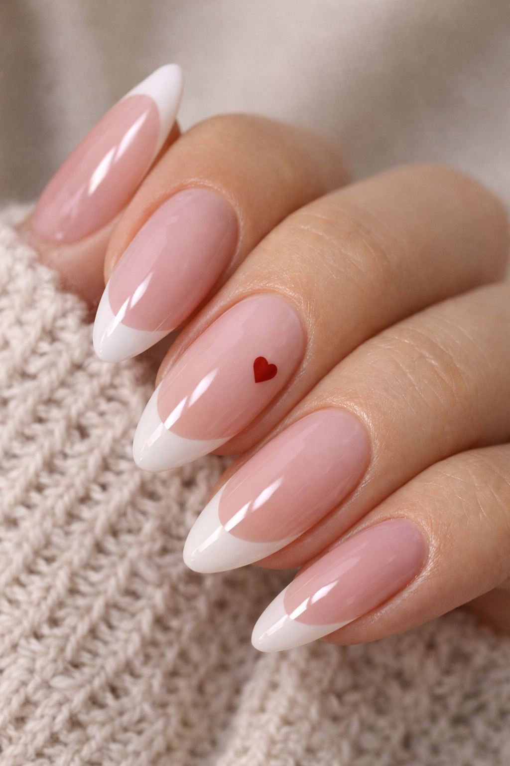 In this style long almond nails are highlighted loose blush-pink base and white French tips. The accent nail has the tiny red heart that gives it a lovely and romantic accent. The shiny finish highlights the hues and provides the manicure with polished appearance.
