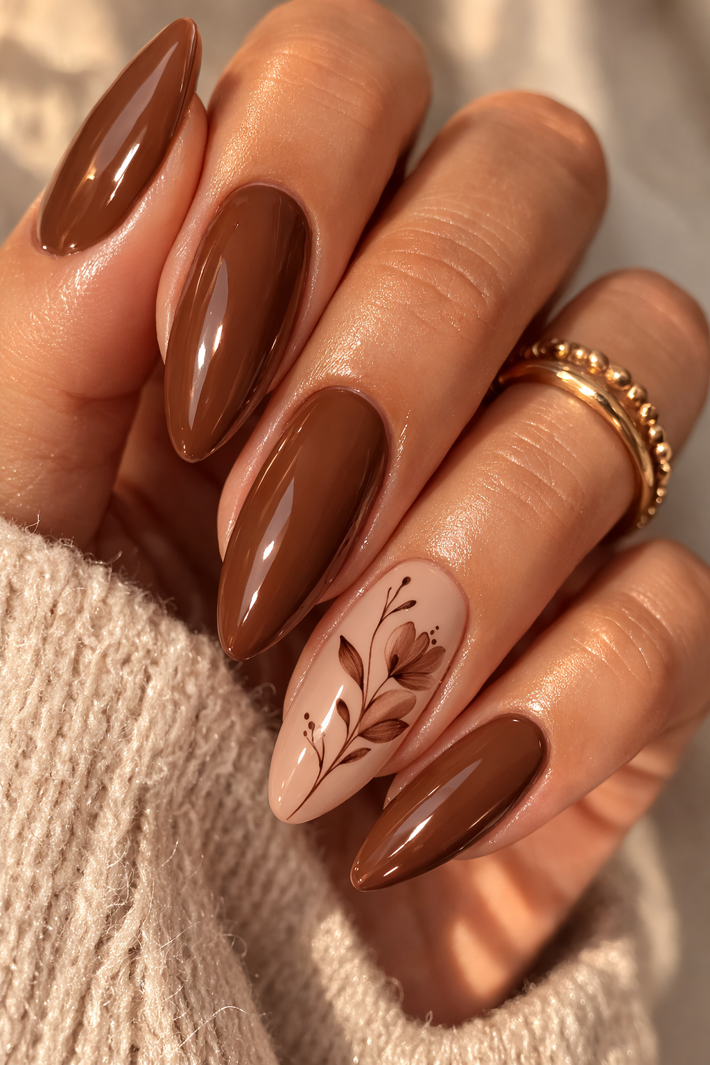 Caramel brown nails bring warmth and softness to any manicure. In this design, caramel polish is paired with a nude accent nail featuring minimal floral line art in a darker brown tone.