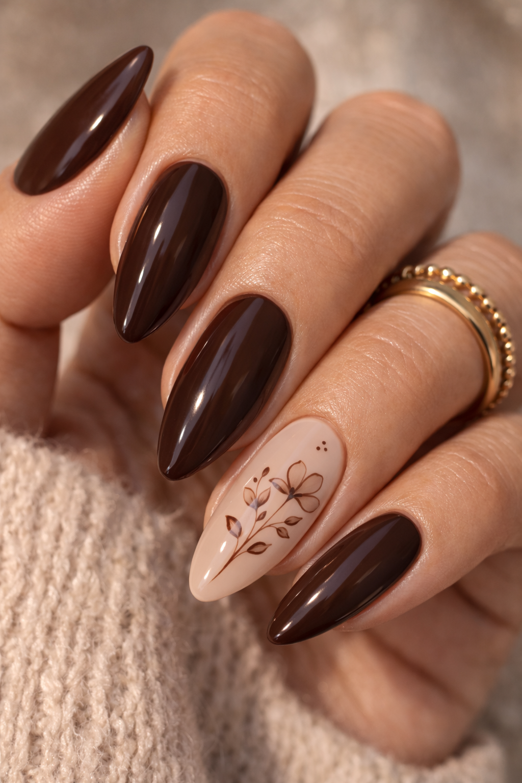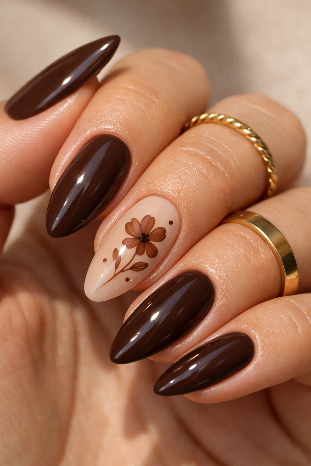 1. Chocolate Brown Floral Almond Nails
