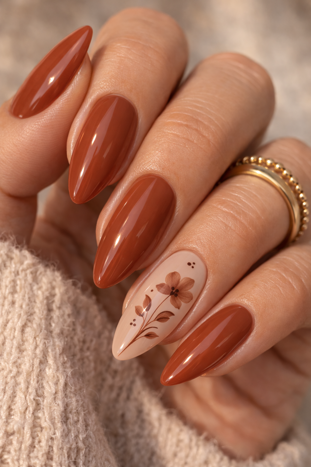 Terracotta nails are warm, earthy, and incredibly fashionable. This manicure combines terracotta brown polish with a nude accent nail featuring delicate hand-painted floral art and small leaf details.